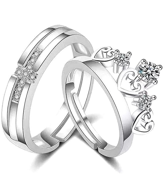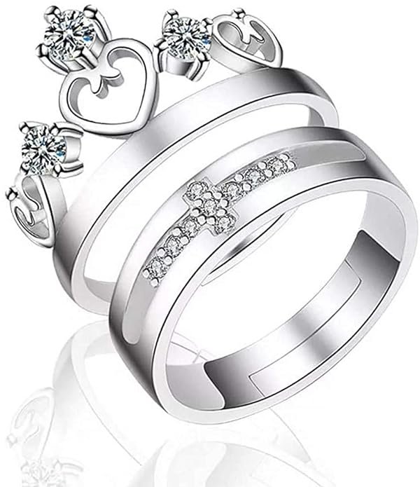 Stylish Silver Copper Crown King Queen Adjustable Couple Ring for Women Girls Pack of 2